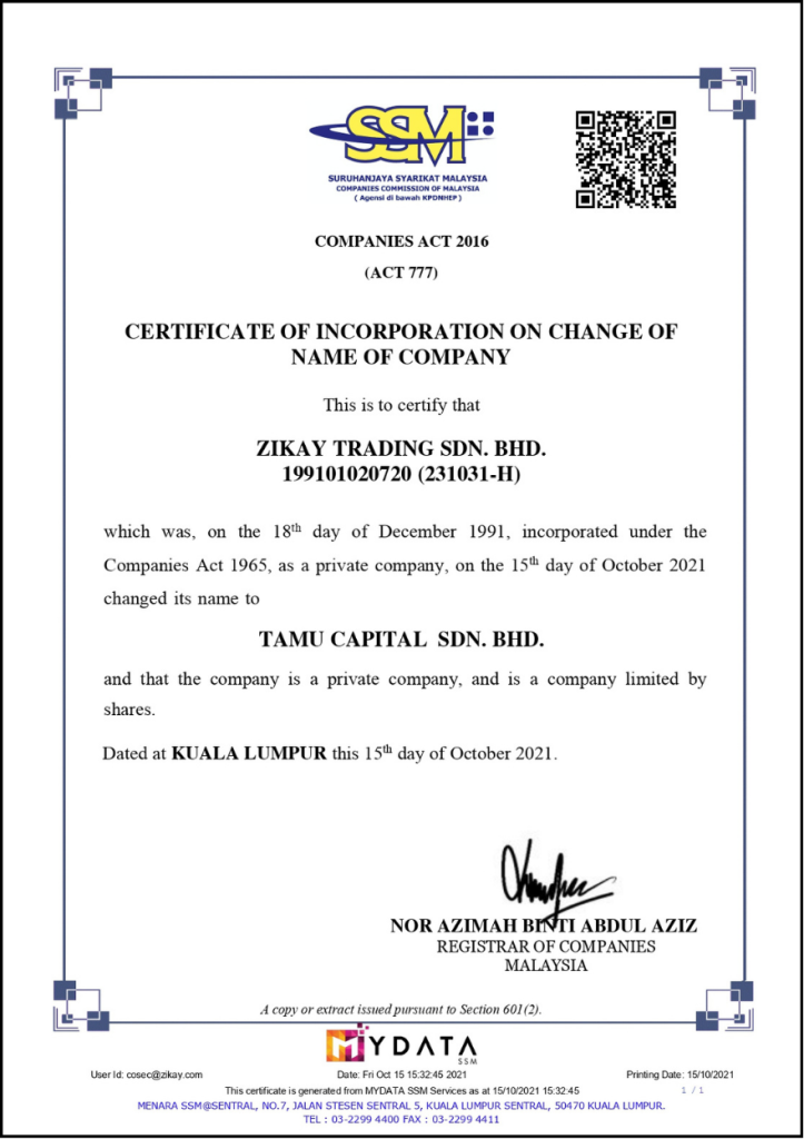 TAMU Capital Berhad was established on 18 December 1991, as a private limited company under the name Zikay Trading. In 2021, the company underwent a rebranding, adopting the name TAMU Capital Berhad, and was subsequently converted into a public limited company on 15 October 2021. With an issued and paid-up capital of RM 1,000,000.00.